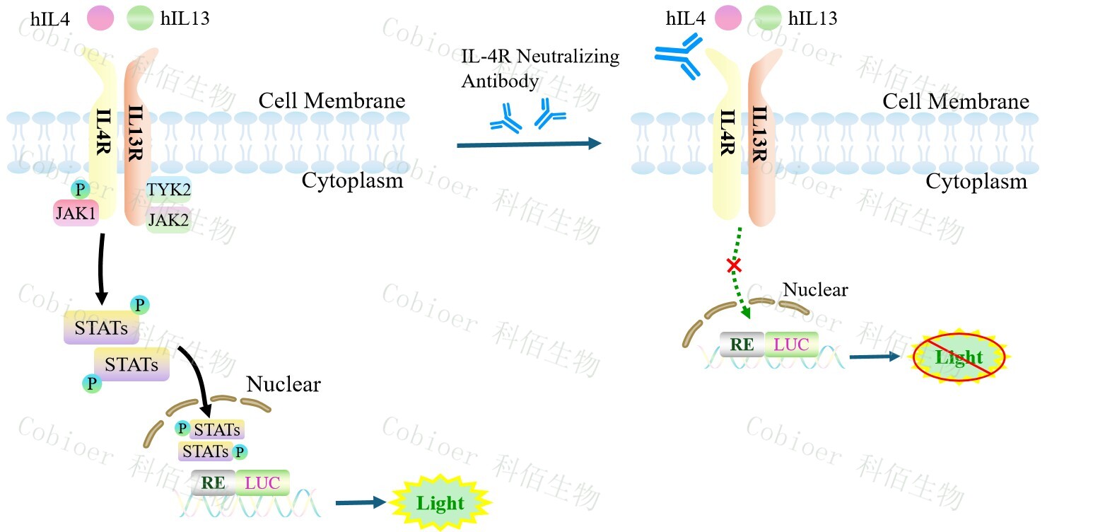 IL4/IL13 Effector Reporter Cell 報(bào)告基因藥靶模型很好的模擬了體內(nèi) IL4/IL13 的信號轉(zhuǎn) 導(dǎo)過程,原理見下圖所示。