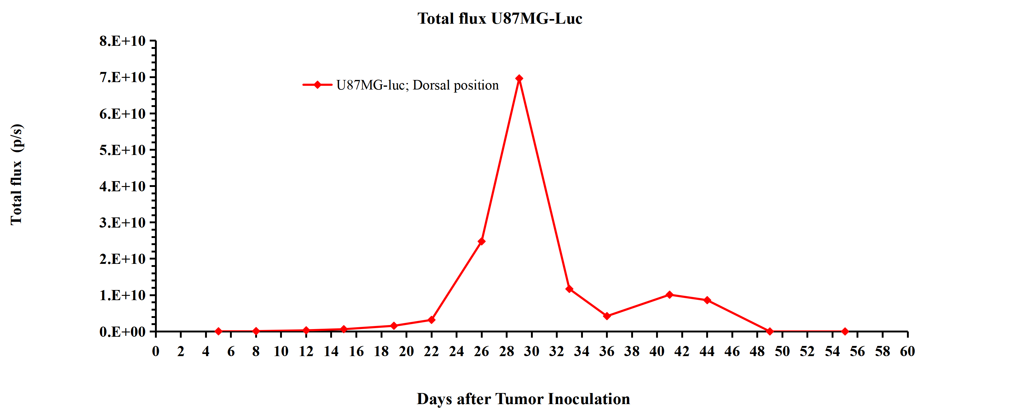 Figure 2. Stablity test results. U87MG-Luc cells showed at least 32 passage stability with similar luminescence unit. |