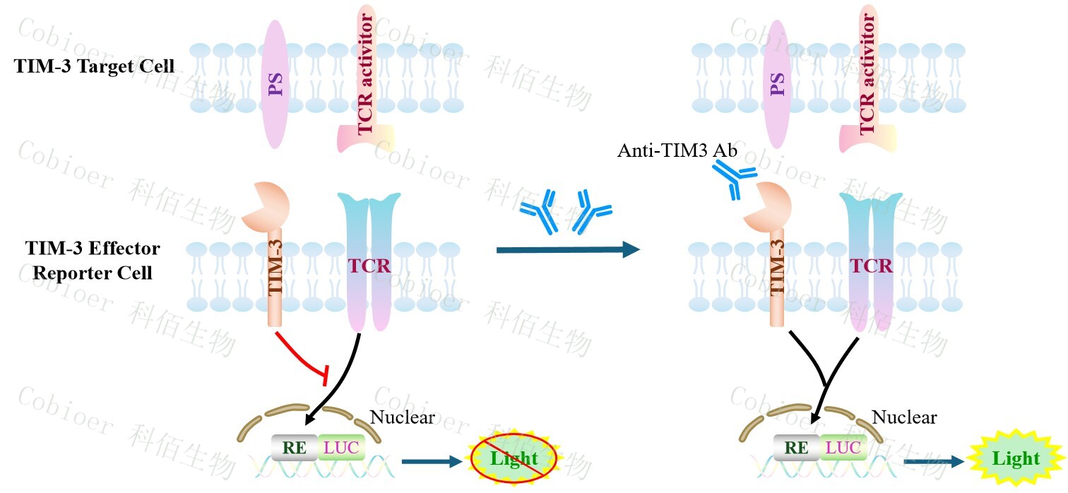 TIM-3 Target Cell 作為 TIM-3 Effector Reporter Cell 的靶細(xì)胞,報(bào)告基因藥靶模型很好的模擬了體內(nèi) TIM-3 的信號(hào)轉(zhuǎn)導(dǎo)過(guò)程,原理見(jiàn)下圖所示。![]() Figure 1. TIM-3 Target Cell 細(xì)胞模型原理圖 |