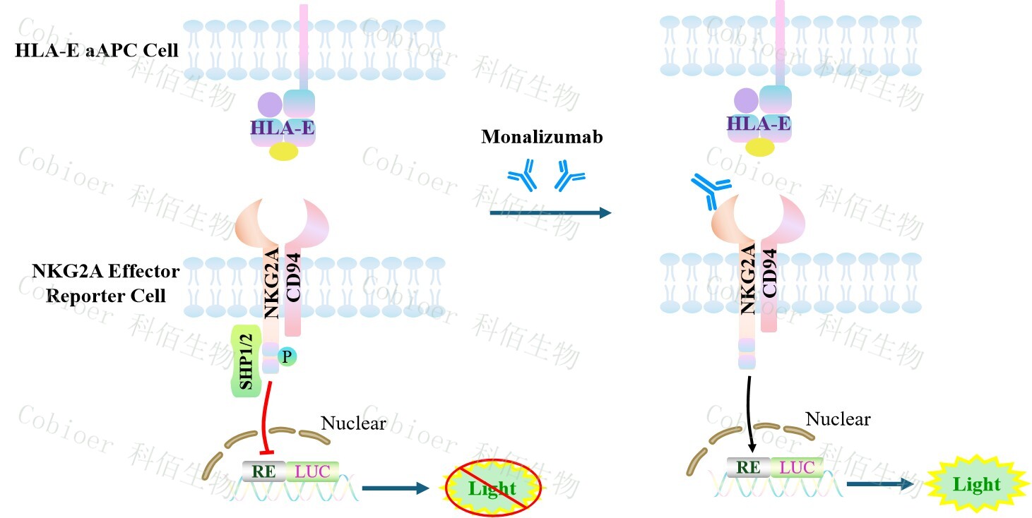 NKG2A Effector Reporter Cell 報(bào)告基因藥靶模型很好的模擬了體內(nèi) NKG2A 的信號轉(zhuǎn)導(dǎo)過程,原理見下圖所示。