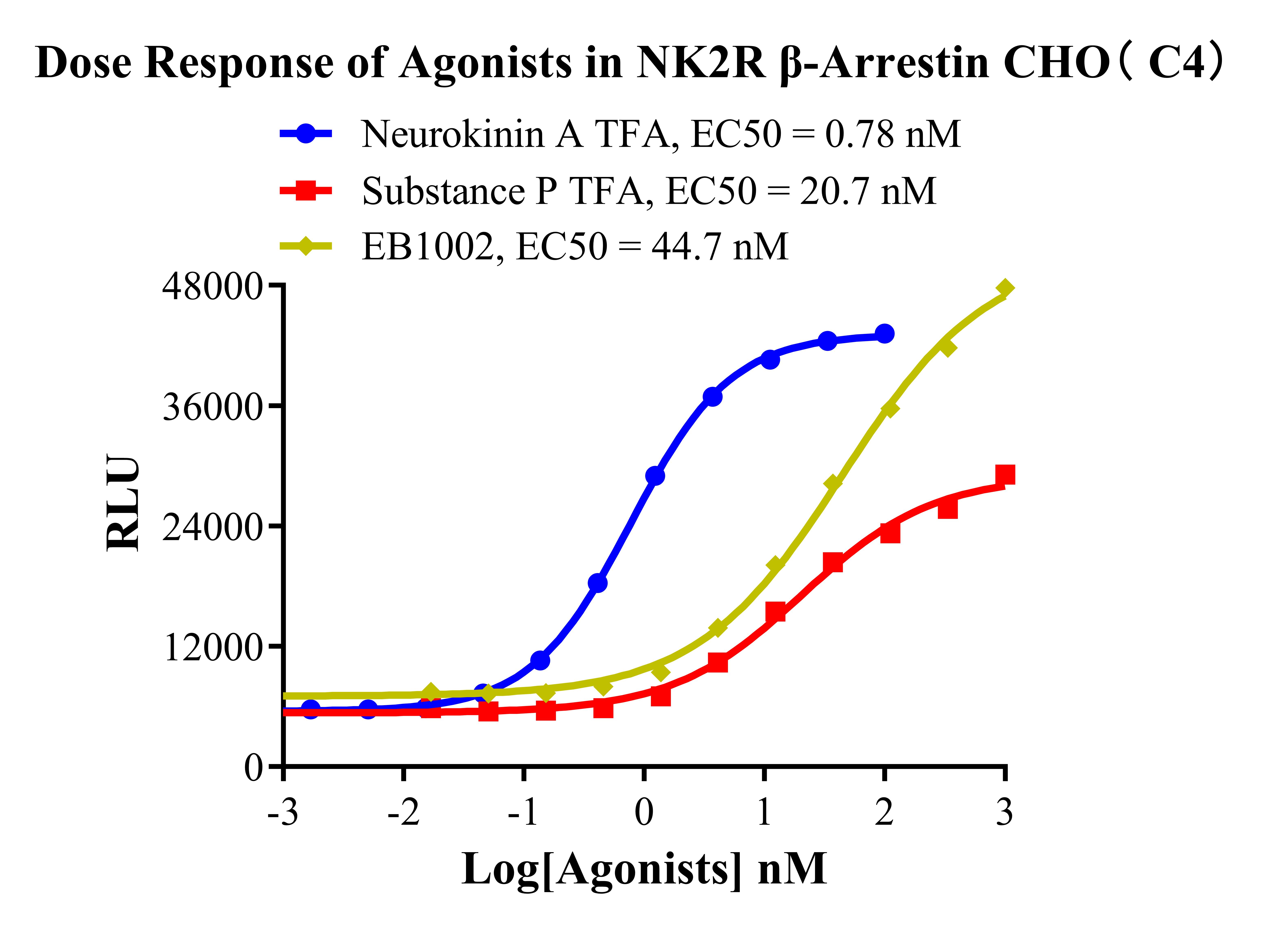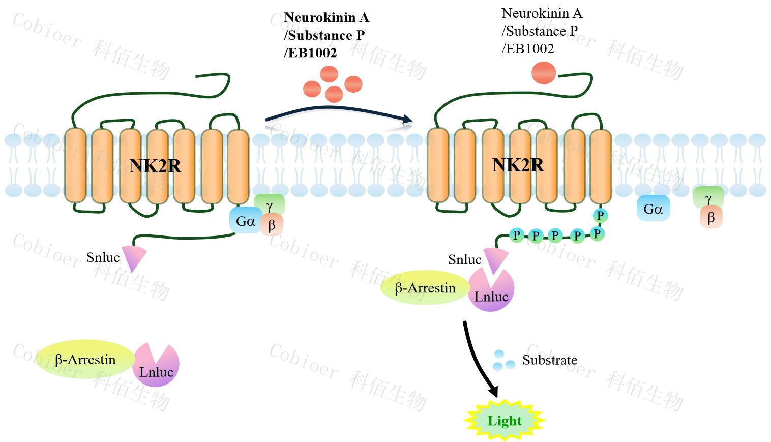 NK2R β-Arrestin CHO 報告基因藥靶模型很好的模擬了體內(nèi) NK2R/β-Arrestin 的信號轉(zhuǎn) 導(dǎo)過程,原理見下圖所示。當(dāng)缺乏配體刺激時,β-Arrestin 不與 NK2R 結(jié)合,融合β-Arrestin 的熒光素酶處于失活構(gòu)象,當(dāng) NK2R 遭遇配體刺激時,融合熒光素酶報告基因的β-Arrestin 被招募,使熒光素酶報告基因處于激活狀態(tài),加入其底物后發(fā)光信號增強(qiáng)。