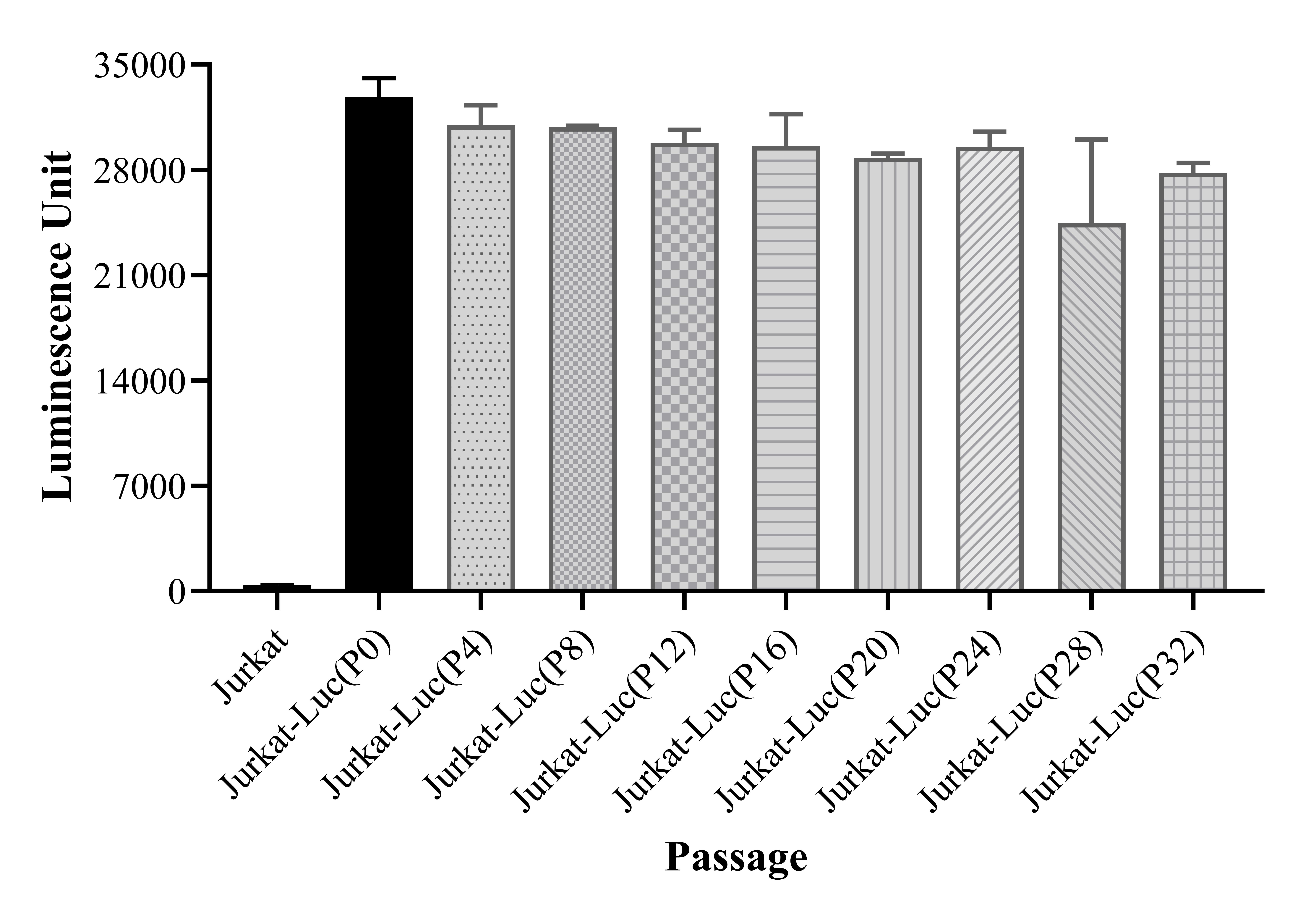 Figure 1. Stablity test results. Jurkat-Luc showed at least 32 passage stability with similar luminescence unit. |