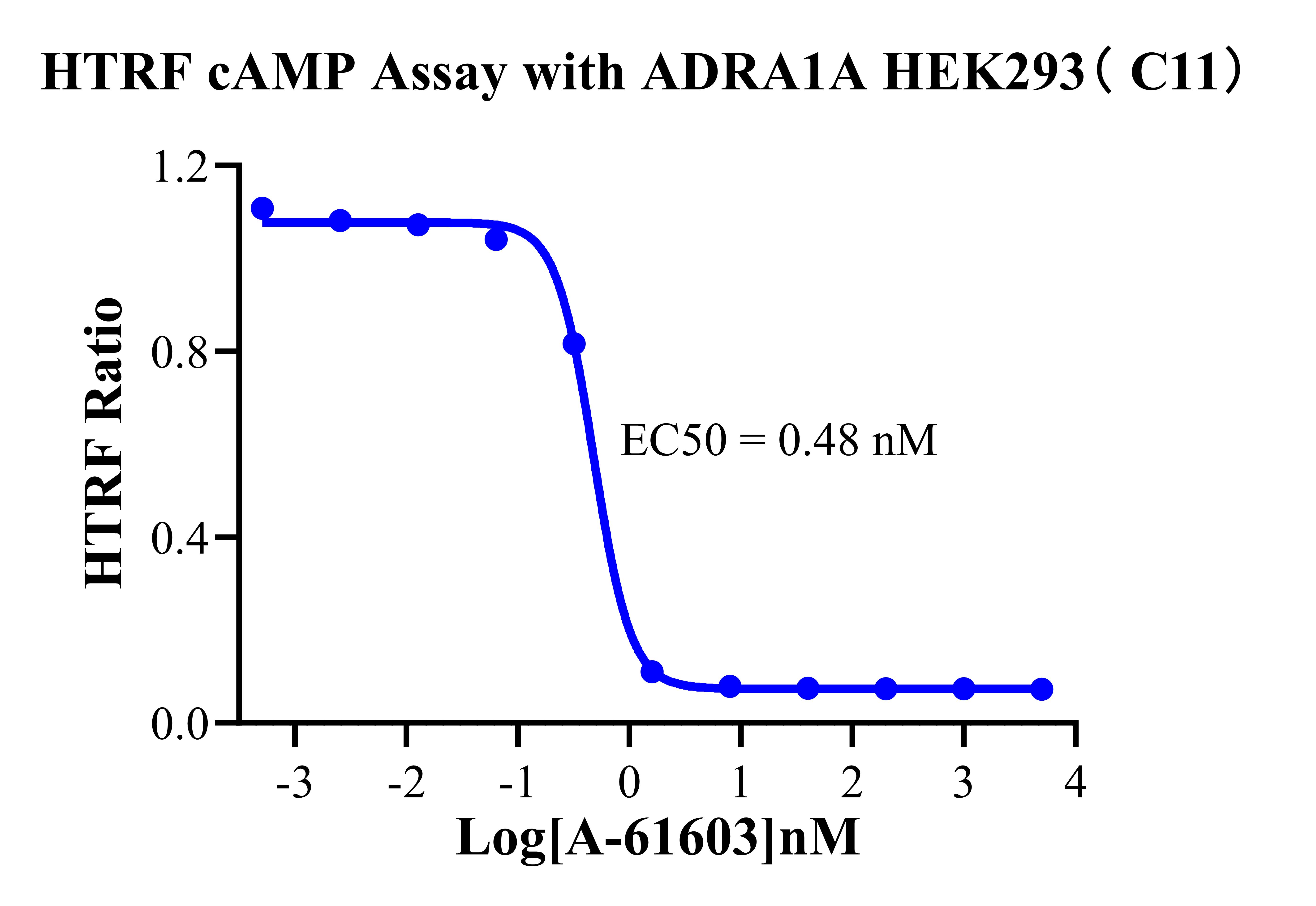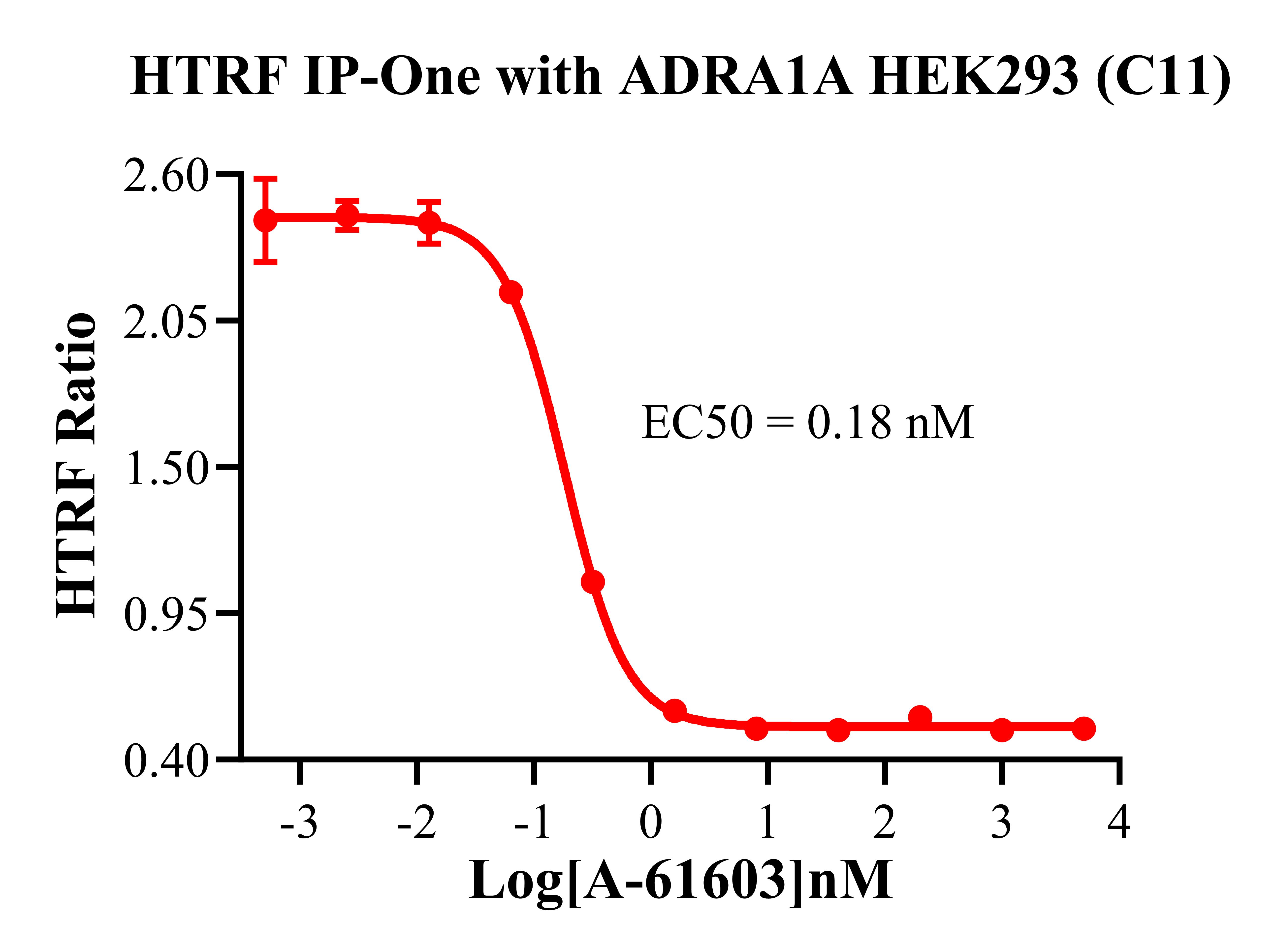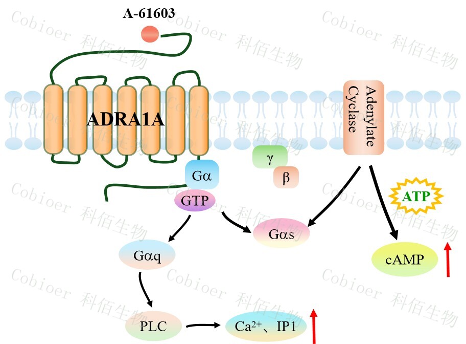 ADRA1A 還可以通過 Gq 蛋白的信號(hào)通路,調(diào)控 IP1 的升高。ADRA1A 與配體結(jié)合, 導(dǎo)致 Gαq 亞基的激活,觸發(fā) PLC-γ,從而產(chǎn)生兩個(gè)第二信使:IP3 和 DAG,它們參與細(xì)胞 內(nèi)鈣動(dòng)員。由于 IP3 在代謝上不穩(wěn)定,因此測(cè)量通路激活的替代標(biāo)志物 IP1 作為檢測(cè)標(biāo)準(zhǔn)。
