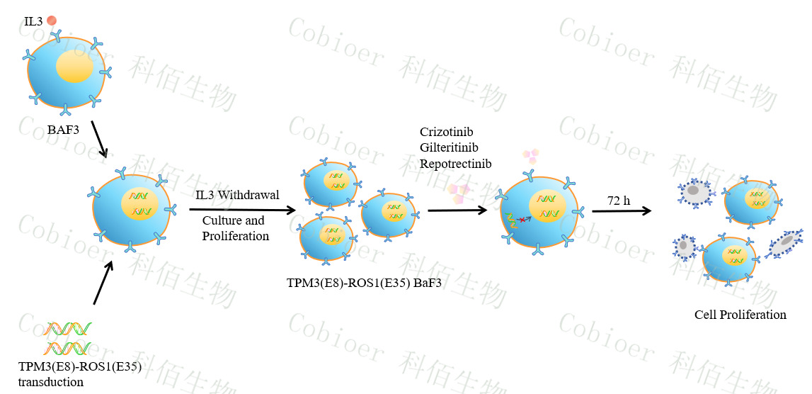 BaF3(小鼠原 B 細胞)的生長和增殖需要 IL-3 的維持。通過引入各種表達激酶的基因, 能作為 BaF3 的驅(qū)動基因,讓 BaF3 不再依賴 IL-3 而增殖,進而激酶基因成為 BaF3 增殖依 賴的驅(qū)動基因,用于評估小分子藥物對激酶的靶向抑制作用,原理及流程見下圖所示。