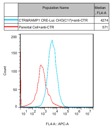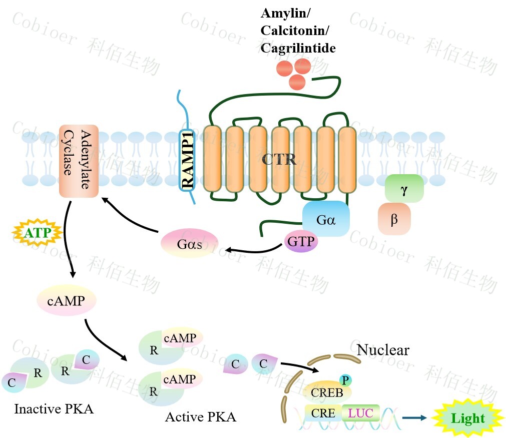 CTR&RAMP1 CRE-Luc CHO 報(bào)告基因藥靶模型很好的模擬了體內(nèi) CTR&RAMP1 的信號(hào)轉(zhuǎn)導(dǎo)過(guò)程,原理見(jiàn)下圖所示。