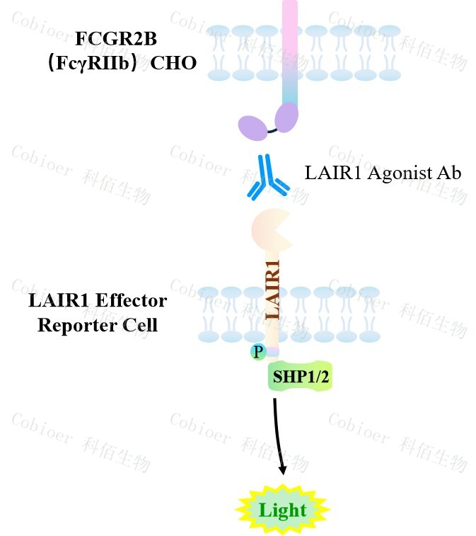LAIR1 Effector Reporter Cell 報(bào)告基因藥靶模型很好的模擬了體內(nèi) LAIR1 的信號(hào)轉(zhuǎn)導(dǎo)過(guò)程,原理見(jiàn)下圖所示。![]() Figure 1.LAIR1 Effector Reporter Cell 細(xì)胞模型原理圖 |