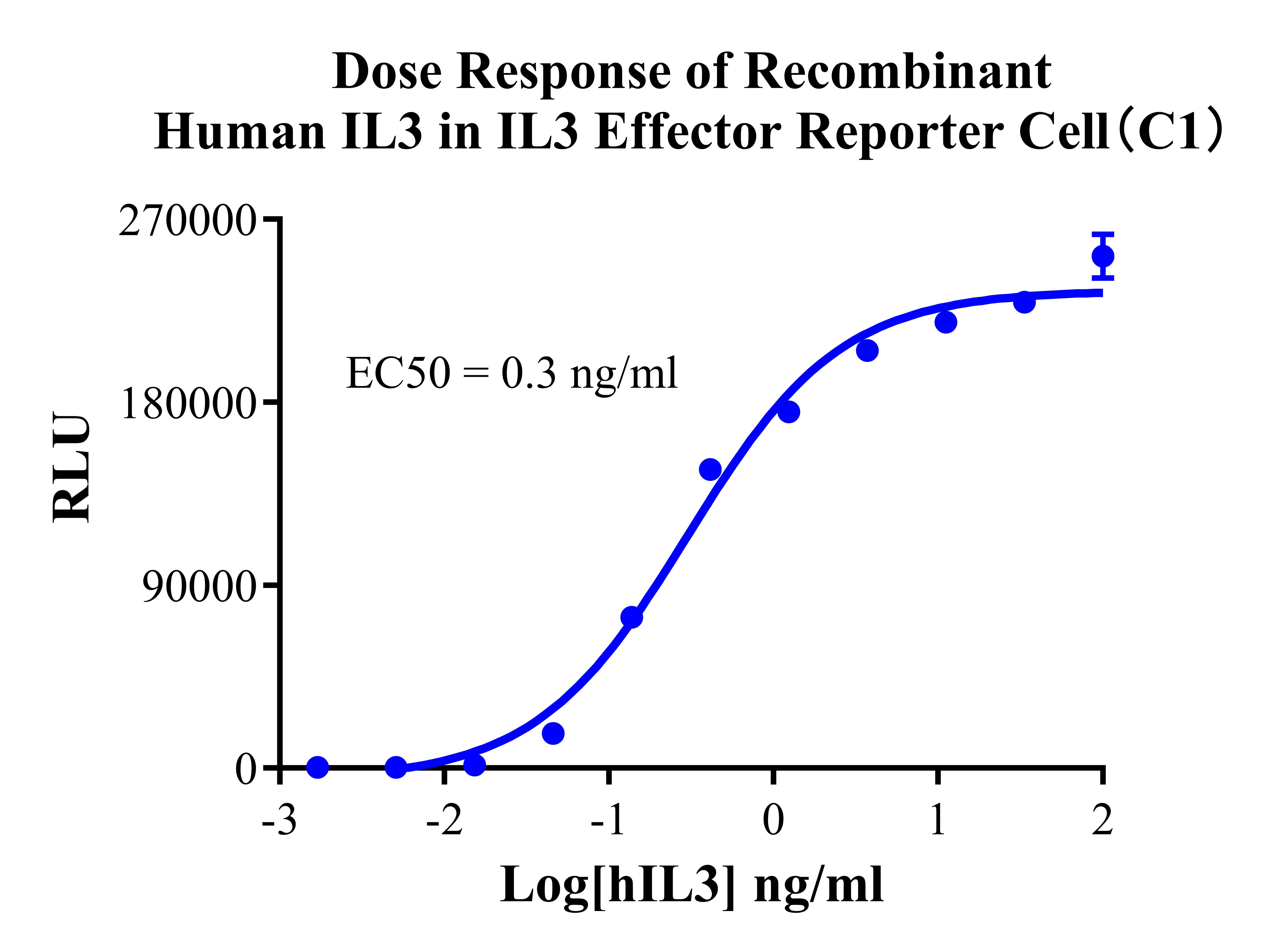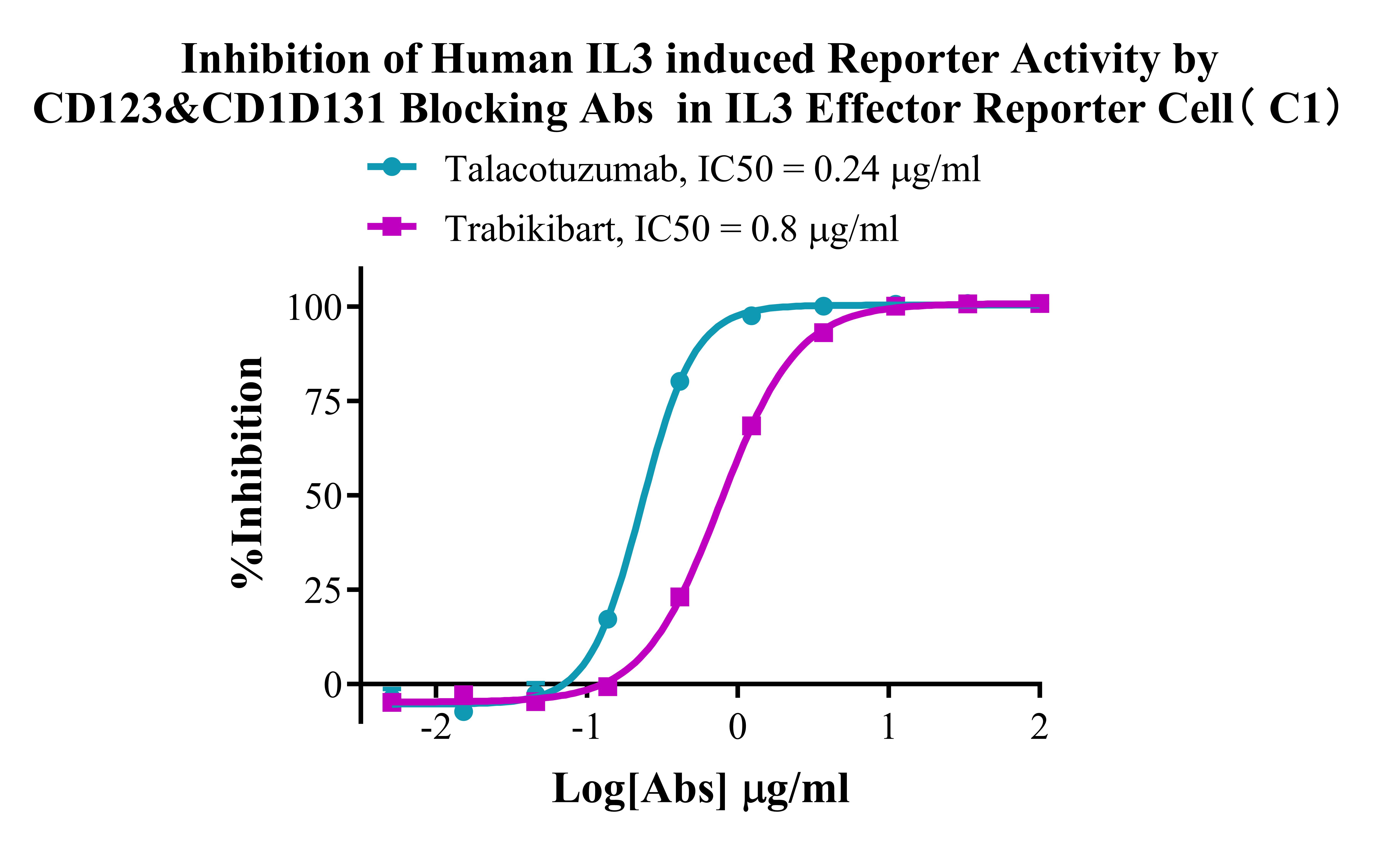 ![]() Figure 2. Recombinant IL3 Effector Reporter Cell stably expressing IL3. ![]() Figure 3. Dose Response of Recombinant Human IL3 in IL3 Effector Reporter Cell(C1). ![]() Figure 4. Inhibition of Human IL3 induced Reporter Activity by CD123&CD1D131 Blocking Abs in IL3 Effector Reporter Cell(C1). |