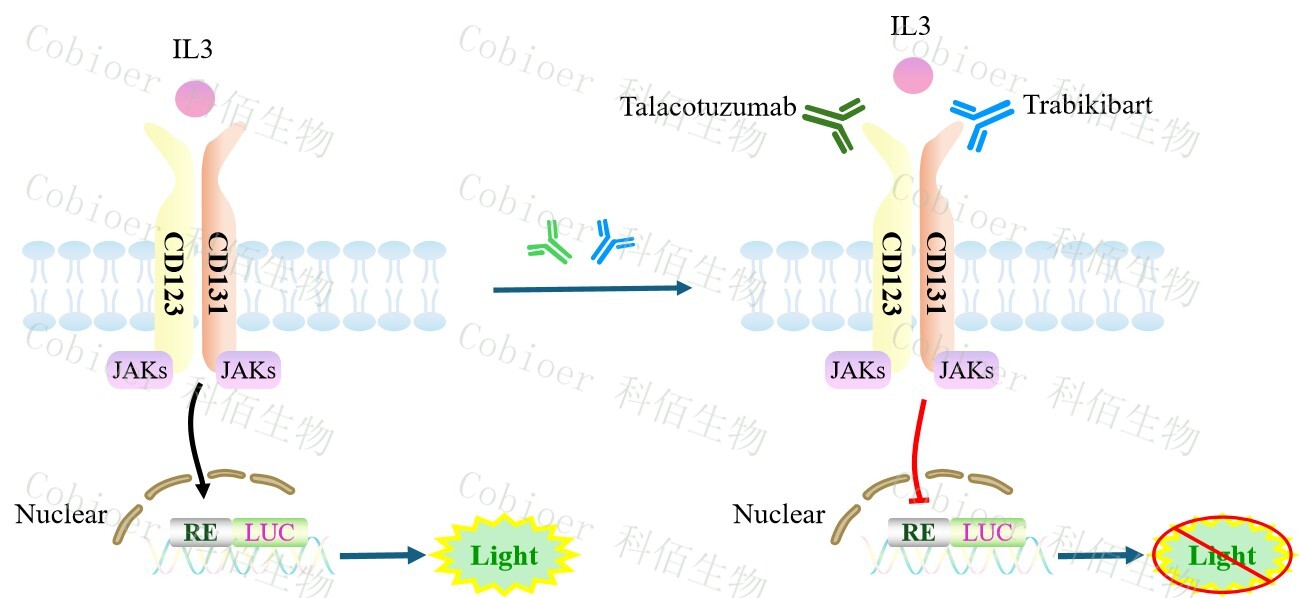 IL3 Effector Reporter Cell 報(bào)告基因藥靶模型很好的模擬了體內(nèi) IL3 的信號(hào)轉(zhuǎn)導(dǎo)過程,原理見下圖所示。![]() Figure 1. IL3 Effector Reporter Cell 細(xì)胞模型原理圖 |