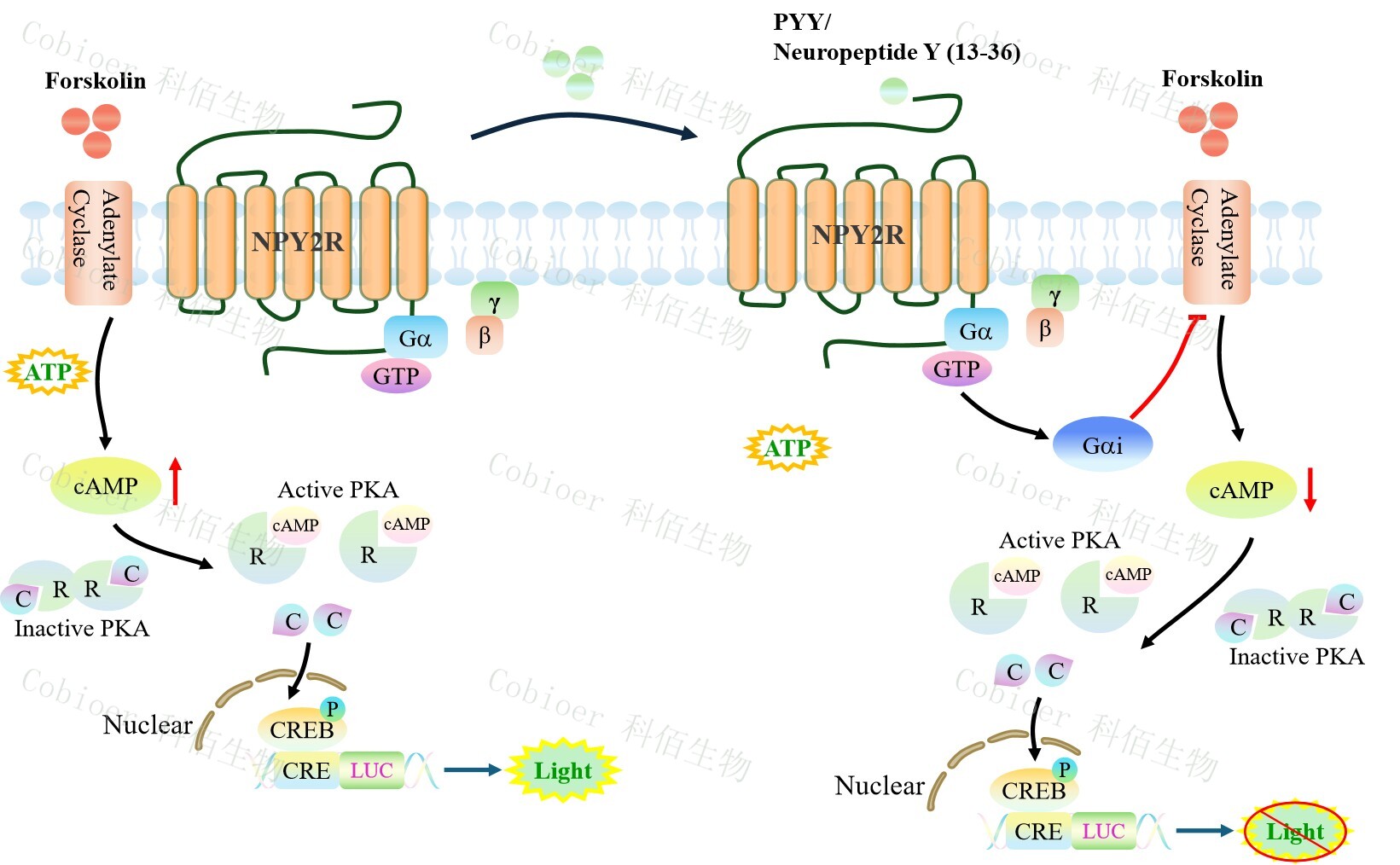 NPY2R CRE-Luc CHO 藥靶模型很好的模擬了體內(nèi) NPY2R 的信號轉(zhuǎn)導(dǎo)過程,原理見下圖所示。![]() Figure 1. NPY2R CRE-Luc CHO 細胞模型原理圖 |