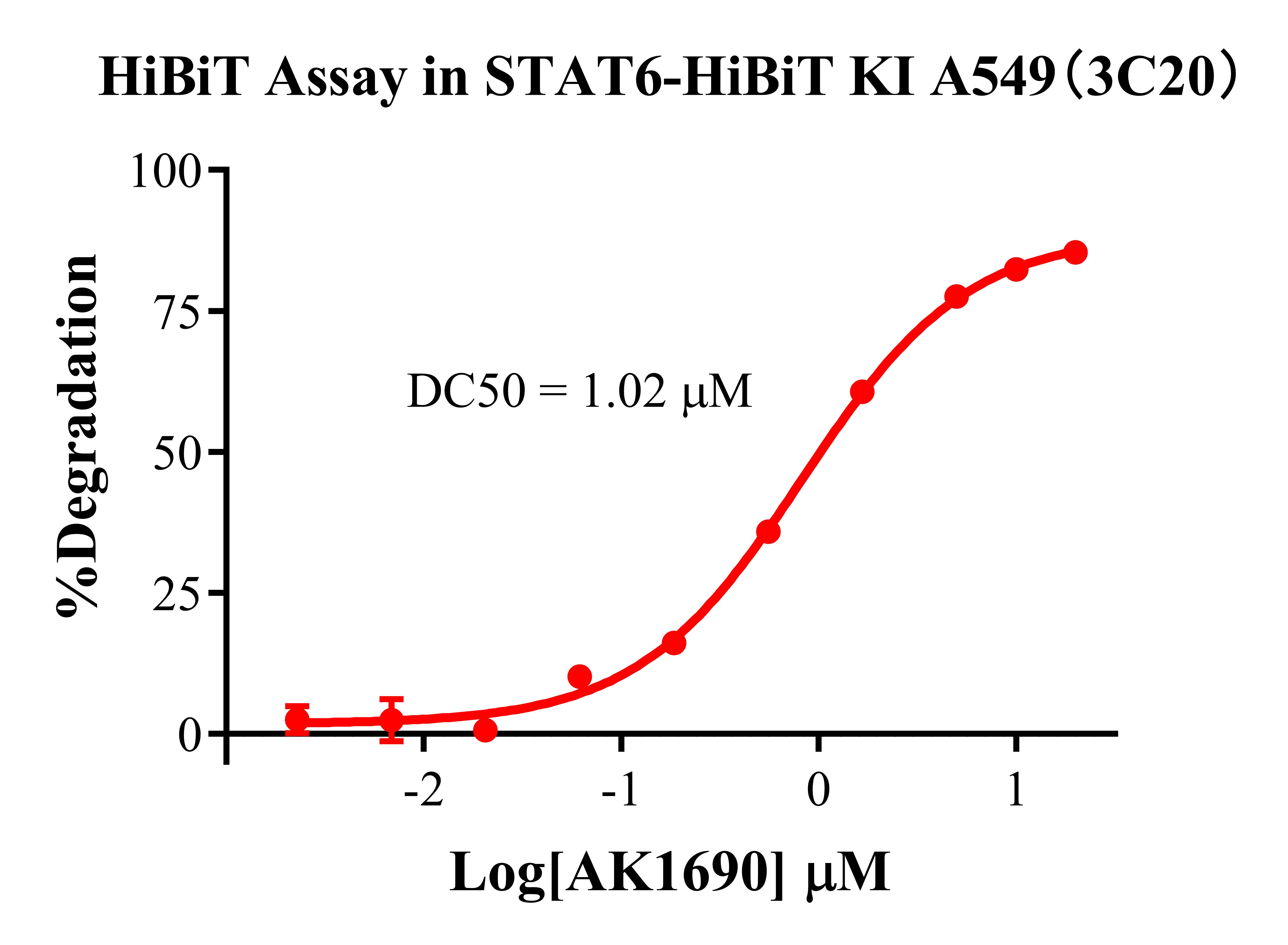 STAT6-HiBiT KI A549 報告基因細胞,通過基因編輯方式將 HiBiT 標簽 插入細胞內源的 STAT6 基因中。AK-1690 是一種有效和選擇性的 STAT6 PROTAC 降解劑, 原理見下圖所示。![]() Figure 1. STAT6-HiBiT KI A549 細胞模型原理圖 |