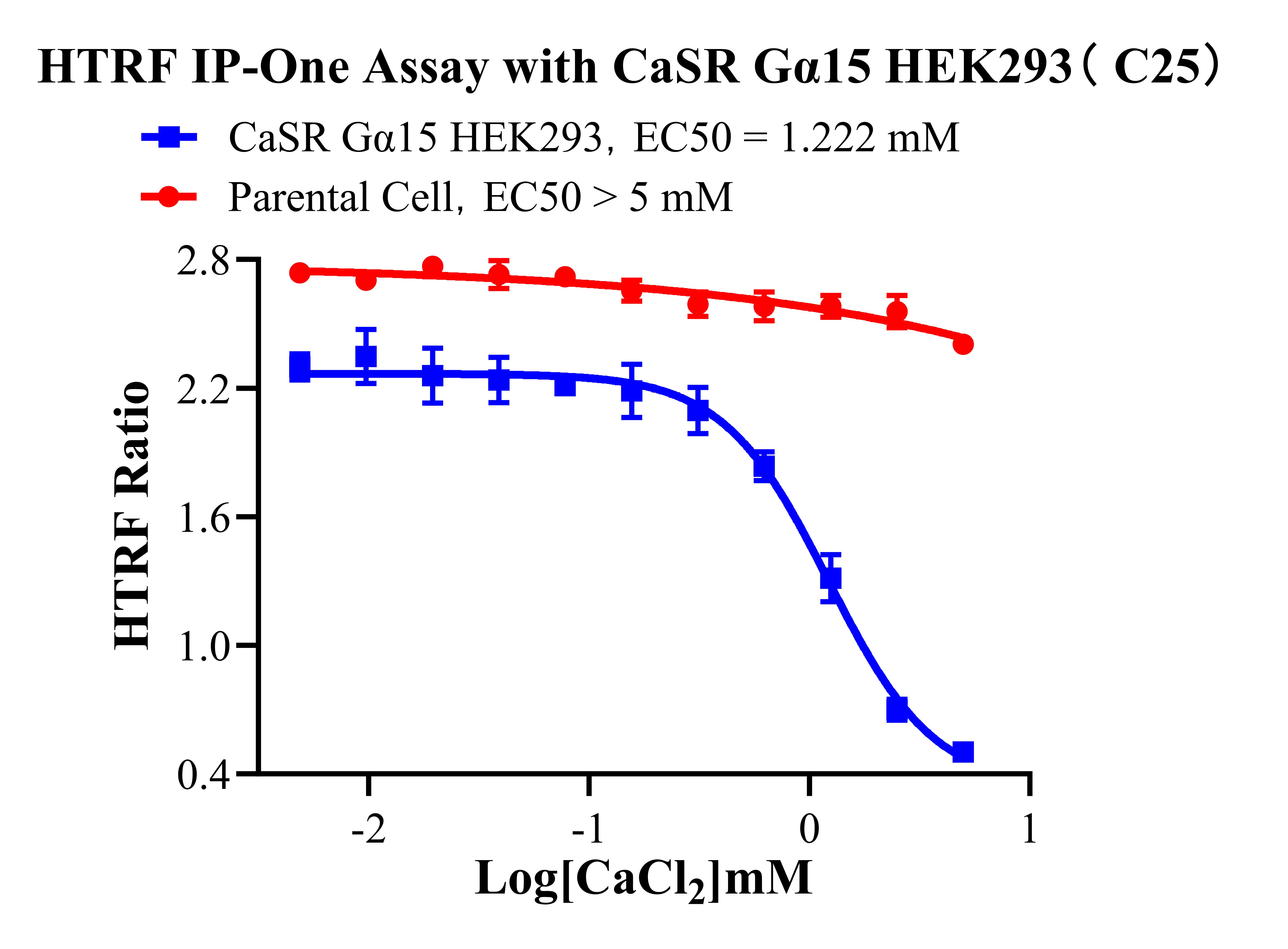 CaSR Gα15 HEK293 藥靶模型很好的模擬了體內(nèi) CaSR 的信號轉(zhuǎn)導(dǎo)過程,原理見下圖所示。![]() Figure 1. CaSR Gα15 HEK293 細(xì)胞模型原理圖 |