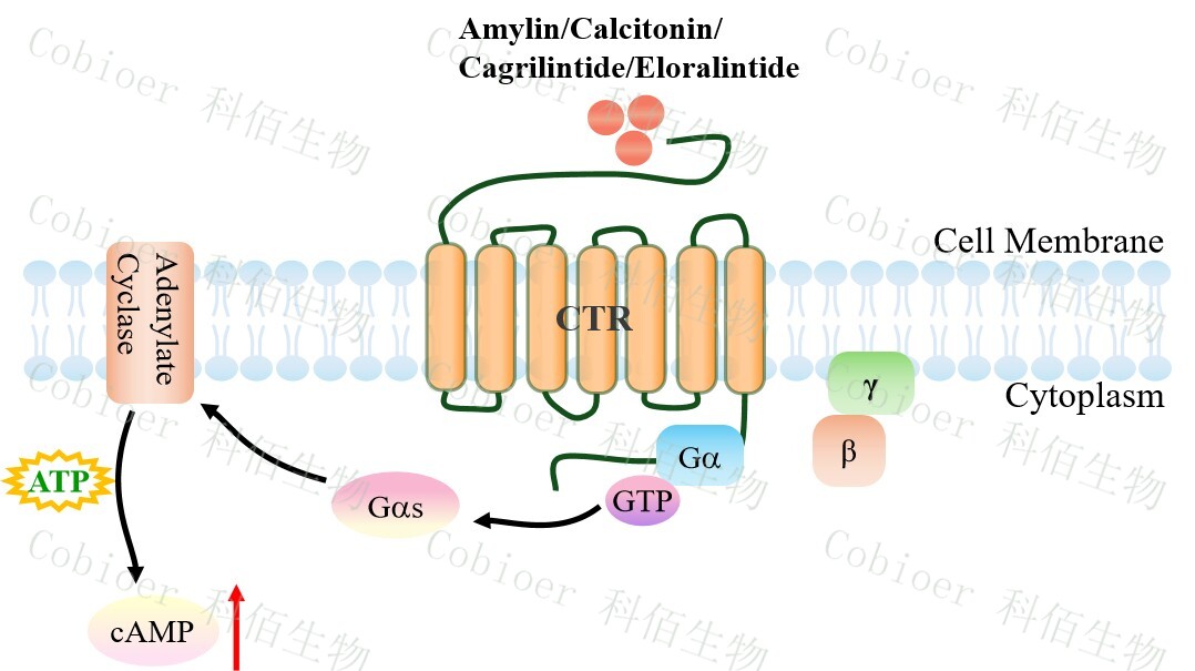 | 降鈣素基因相關肽(CGRP)家族包括 CGRP 本身、降鈣素(CT)、腎上腺髓質素 (AM)和胰島淀粉樣肽(AMY)。 胰淀素(Amylin)受體的三種類型的已被確定,即 AMY1,AMY2 和 AMY3。胰淀素 受體屬于 B 類 GPCR,是異二聚體復合物,由降鈣素受體(CTR)與受體活性修飾蛋白 (RAMPs)結合形成。該受體的 CTR 組分具有相同的 GPCR 結構:7 個跨膜相互連接的α- 螺旋,將細胞外信號傳遞到細胞內細胞質信號級聯(lián)。RAMP 有三種類型(RAMP1、 RAMP2 和 RAMP3),它們共享 31%的氨基酸序列,具有相似的基本結構。RAMP 是將 CTR 轉運到細胞膜并調節(jié)其配體特異性的重要肽,它可以改變特定 GPCR 的藥理學、功能 和細胞運輸。 哺乳動物細胞中 Amylin 受體的激活已被證明可以提高 cAMP,并被認為與 Gs 蛋白和 腺苷酸環(huán)化酶的刺激有關。在 RAMPs 的存在下,其與胰淀素的結合親和力可以被修飾。 CTR 和 RAMP1 或 CTR 和 RAMP3 的異質結構被認為有利于與胰淀素結合,介導大腦中的 生理功能。AMY3 的激活刺激 G 蛋白 Gαs,進一步控制腺苷酸環(huán)化酶(AC),隨后增加細 胞 cAMP。cAMP 與 PKA 調控亞基(R2)的結合誘導 PKA 四聚體全酶解離,導致 PKA 催 化亞基的激活。cAMP 激活的 PKA 參與調控 ERK1/2 的活性。ERK1/2 通路的觸發(fā)可能導致 Ca 2+分布不均勻,引發(fā)內質網(wǎng)和線粒體功能障礙,導致細胞死亡。此外,cAMP 刺激 AKT 進一步導致轉錄因子 cFos 的表達。 |