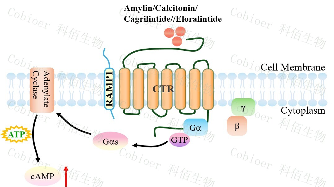 | 降鈣素基因相關(guān)肽(CGRP)家族包括 CGRP 本身、降鈣素(CT)、腎上腺髓質(zhì)素 (AM)和胰島淀粉樣肽(AMY)。 胰淀素(Amylin)受體的三種類型的已被確定,即 AMY1,AMY2 和 AMY3。胰淀素 受體屬于 B 類 GPCR,是異二聚體復(fù)合物,由降鈣素受體(CTR)與受體活性修飾蛋白 (RAMPs)結(jié)合形成。該受體的 CTR 組分具有相同的 GPCR 結(jié)構(gòu):7 個(gè)跨膜相互連接的α- 螺旋,將細(xì)胞外信號(hào)傳遞到細(xì)胞內(nèi)細(xì)胞質(zhì)信號(hào)級(jí)聯(lián)。RAMP 有三種類型(RAMP1、 RAMP2 和 RAMP3),它們共享 31%的氨基酸序列,具有相似的基本結(jié)構(gòu)。RAMP 是將 CTR 轉(zhuǎn)運(yùn)到細(xì)胞膜并調(diào)節(jié)其配體特異性的重要肽,它可以改變特定 GPCR 的藥理學(xué)、功能 和細(xì)胞運(yùn)輸。 哺乳動(dòng)物細(xì)胞中 Amylin 受體的激活已被證明可以提高 cAMP,并被認(rèn)為與 Gs 蛋白和 腺苷酸環(huán)化酶的刺激有關(guān)。在 RAMPs 的存在下,其與胰淀素的結(jié)合親和力可以被修飾。 CTR 和 RAMP1 或 CTR 和 RAMP3 的異質(zhì)結(jié)構(gòu)被認(rèn)為有利于與胰淀素結(jié)合,介導(dǎo)大腦中的 生理功能。AMY3 的激活刺激 G 蛋白 Gαs,進(jìn)一步控制腺苷酸環(huán)化酶(AC),隨后增加細(xì) 胞 cAMP。cAMP 與 PKA 調(diào)控亞基(R2)的結(jié)合誘導(dǎo) PKA 四聚體全酶解離,導(dǎo)致 PKA 催 化亞基的激活。cAMP 激活的 PKA 參與調(diào)控 ERK1/2 的活性。ERK1/2 通路的觸發(fā)可能導(dǎo)致 Ca 2+分布不均勻,引發(fā)內(nèi)質(zhì)網(wǎng)和線粒體功能障礙,導(dǎo)致細(xì)胞死亡。此外,cAMP 刺激 AKT 進(jìn)一步導(dǎo)致轉(zhuǎn)錄因子 cFos 的表達(dá)。 |