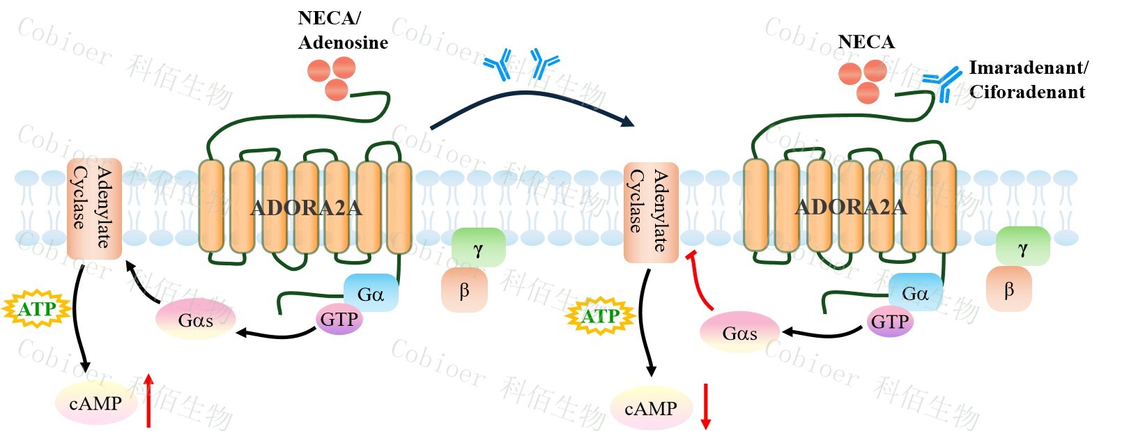 ADORA2A Gα15 CHO 細(xì)胞藥靶模型很好的模擬了體內(nèi) ADORA2A 的信號轉(zhuǎn)導(dǎo)過程, 原理見下圖所示。