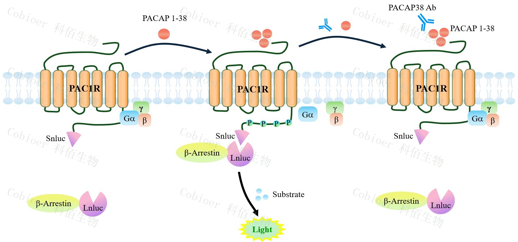 PAC1R β-Arrestin CHO 報告基因藥靶模型很好的模擬了體內(nèi) PAC1R/β-Arrestin 的信號轉(zhuǎn)導過程,原理見下圖所示。當缺乏配體刺激時,β-Arrestin 不與 PAC1R 結合,融合β- Arrestin 的熒光素酶處于失活構象,當 PAC1R 遭遇配體刺激時,融合熒光素酶報告基因的 β-Arrestin 被招募,使熒光素酶報告基因處于激活狀態(tài),加入其底物后發(fā)光信號增強。![]() Figure 1. PAC1R β-Arrestin CHO 細胞模型原理圖 |