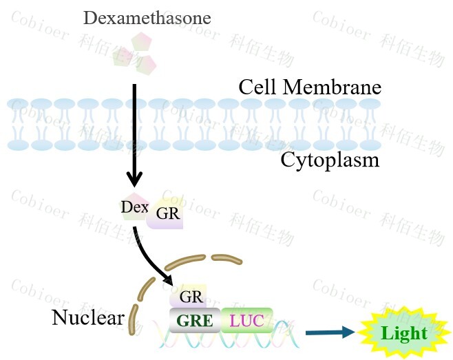 GRE-Luc HEK293 報告基因細(xì)胞,是由 GRE 調(diào)控并表達(dá) Luc 熒光素酶 報告基因的 HEK293 細(xì)胞。Dexamethasone (Hexadecadrol,地塞米松)是糖皮質(zhì)激素受體 (Glucocorticoid Receptor)激動劑、凋亡誘導(dǎo)劑,原理見下圖所示。![]() Figure 1. GRE-Luc HEK293 細(xì)胞原理示意圖 |