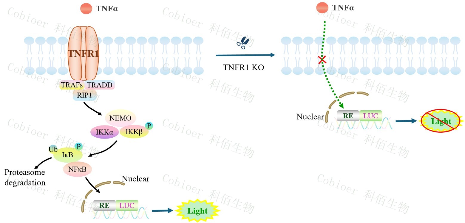 TNFR1 KO NFκB-Luc Jurkat 報(bào)告基因藥靶模型很好的模擬了體內(nèi) NFκB 的信號(hào)轉(zhuǎn)導(dǎo)過(guò)程,原理見(jiàn)下圖所示。![]() Figure 1. TNFR1 KO NFκB-Luc Jurkat 細(xì)胞模型原理圖 |