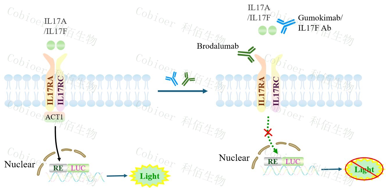 IL17A/17F Effector Reporter Cell 報(bào)告基因藥靶模型很好的模擬了體內(nèi) IL17A/17F 的信號(hào)轉(zhuǎn)導(dǎo)過(guò)程,原理見(jiàn)下圖所示。![]() Figure 1. IL17A/17F Effector Reporter Cell 細(xì)胞模型原理圖 |