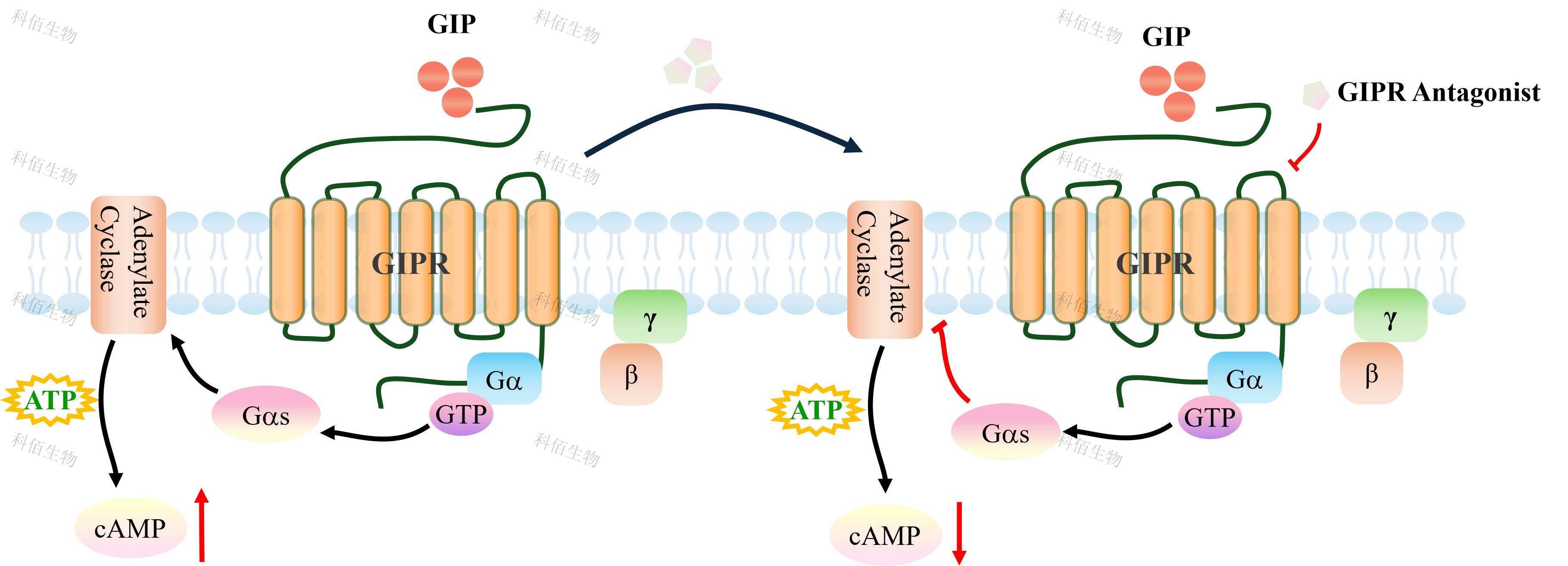 葡萄糖依賴性胰島素促泌多肽(又稱抑胃肽,GIP)、胰高血糖素樣肽-1(GLP-1)和 胰高血糖素(GCG)是負(fù)責(zé)葡萄糖穩(wěn)態(tài)的肽激素。它們的同源受體GIPR、GLP-1R和 GCGR屬于B1類GPCR家族。胃抑制多肽受體(GIPR)是GIP的受體,是一種具有7個 跨膜結(jié)構(gòu)域的G蛋白偶聯(lián)受體。它與GIP激素結(jié)合,以葡萄糖誘導(dǎo)的方式增強胰腺β細胞 胰島素的合成和分泌。胰腺β細胞上的GIPR在信號級聯(lián)中起著關(guān)鍵作用,導(dǎo)致血糖水平 升高時胰島素釋放。 |