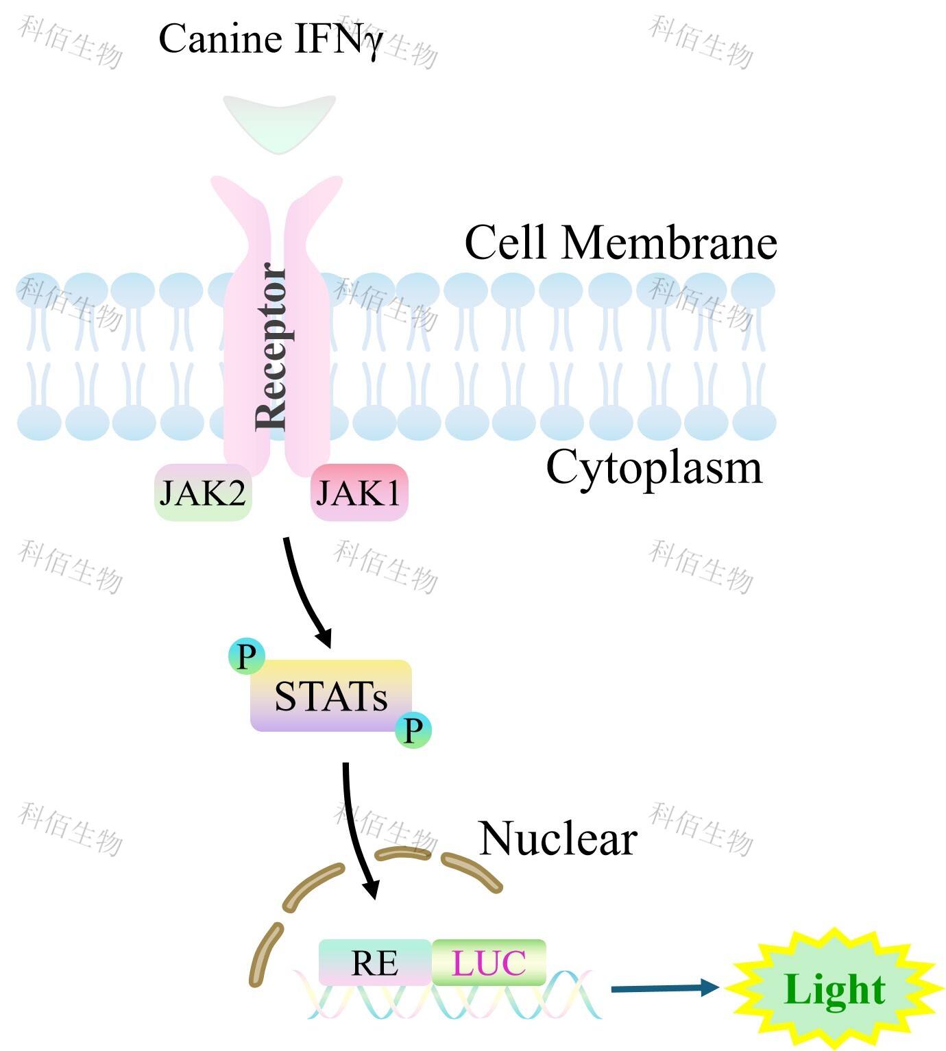 Canine IFNγ Effector Reporter Cell 報告基因細胞,是由調(diào)控因子調(diào)控并表 達 Luc 熒光素酶報告基因的重組細胞。IFNγ與受體結(jié)合,激活下游信號通路的原理見下圖所示。![]() Figure 1. Canine IFNγ Effector Reporter Cell 細胞模型原理圖 |