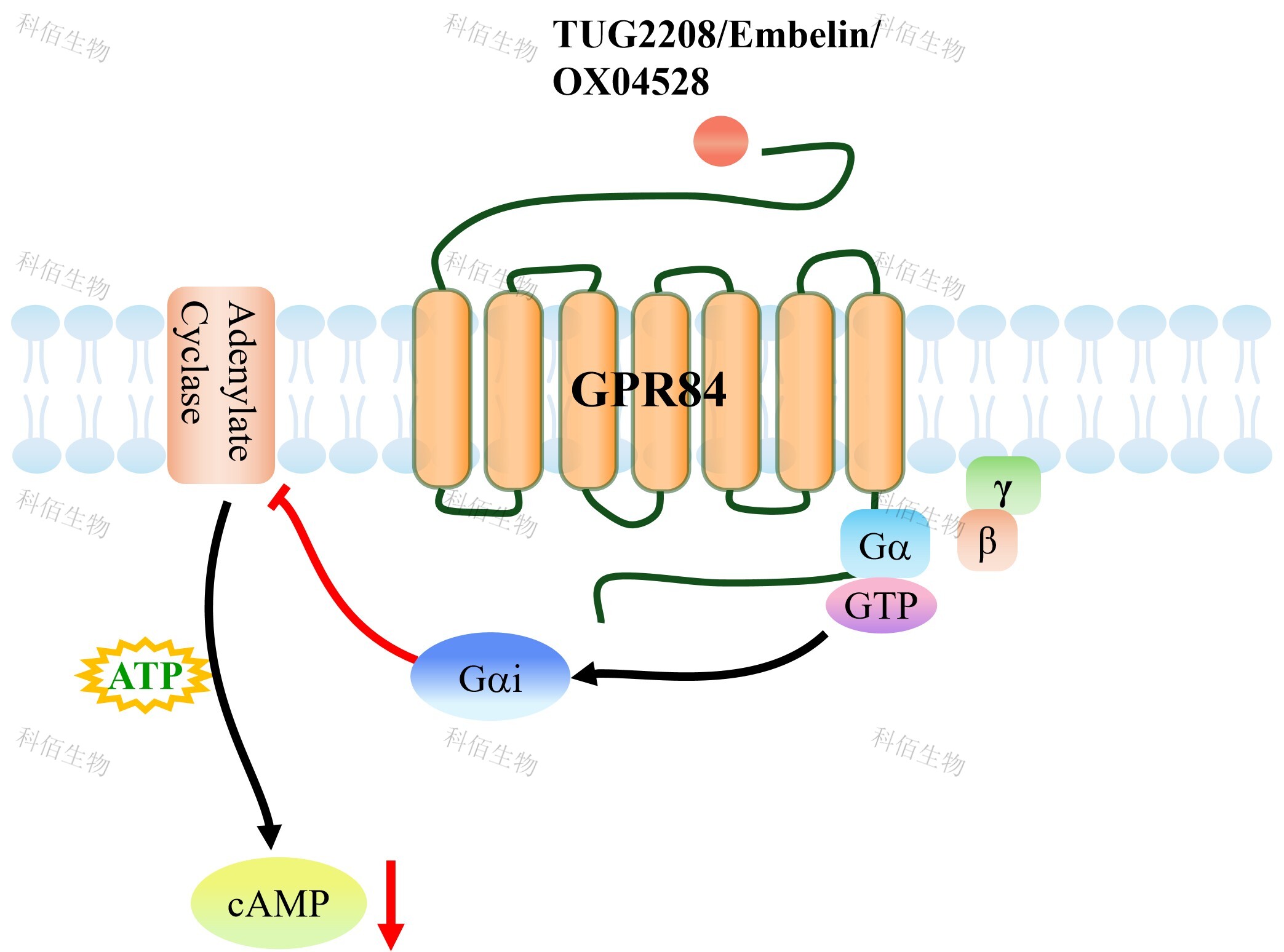 | GPR84 是一種在巨噬細(xì)胞和中性粒細(xì)胞等髓系免疫細(xì)胞中高表達(dá)的 A 類 GPCR,正常 狀態(tài)下表達(dá)水平較低,但在脂多糖(LPS)或促炎細(xì)胞因子刺激下顯著上調(diào),被視為連接 脂肪酸代謝與先天性免疫應(yīng)答的關(guān)鍵節(jié)點(diǎn)。GPR84 的內(nèi)源性配體主要為碳鏈長度 C9-C14 的中鏈脂肪酸(以癸酸和月桂酸為代表),合成激動(dòng)劑 6-OAU 和 DL-175 常用于實(shí)驗(yàn)研究。 在信號(hào)轉(zhuǎn)導(dǎo)層面,GPR84 主要通過偶聯(lián)抑制性 G 蛋白(Gi/o)發(fā)揮功能:活化后抑制腺苷 酸環(huán)化酶、降低胞內(nèi)環(huán)磷酸腺苷(cAMP)水平,同時(shí)其釋放的 Gβγ亞基可激活磷脂酶 C (PLC)、磷脂酰肌醇 3-激酶(PI3K)及絲裂原活化蛋白激酶(MAPK/ERK)通路,最終 促進(jìn) TNFα、IL-6 等促炎因子釋放,并增強(qiáng)中性粒細(xì)胞的趨化、黏附及活性氧產(chǎn)生,從而 在炎癥性腸病、器官纖維化和代謝綜合征等病理過程中發(fā)揮促炎推動(dòng)作用。 | |