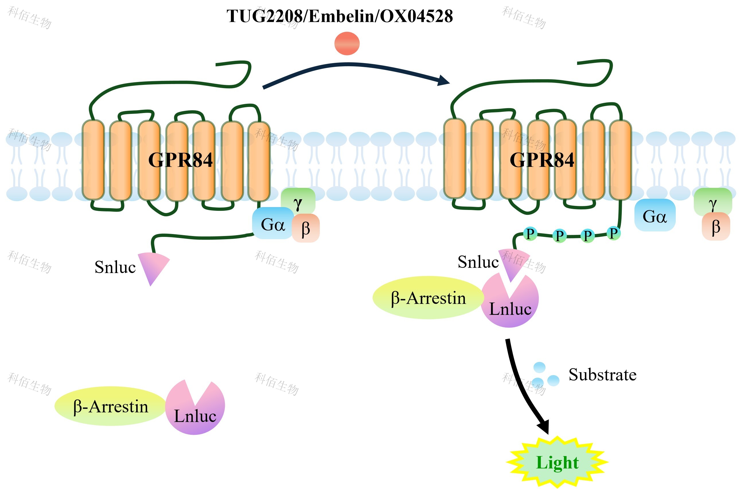 GPR84 β-Arrestin CHO 報(bào)告基因藥靶模型很好的模擬了體內(nèi) GPR84/β-Arrestin 的信號(hào)轉(zhuǎn)導(dǎo)過(guò)程,原理見(jiàn)下圖所示。當(dāng)缺乏配體刺激時(shí),β-Arrestin 不與 GPR84 結(jié)合,融合β- Arrestin 的熒光素酶處于失活構(gòu)象,當(dāng) GPR84 遭遇配體刺激時(shí),融合熒光素酶報(bào)告基因的 β-Arrestin 被招募,使熒光素酶報(bào)告基因處于激活狀態(tài),加入其底物后發(fā)光信號(hào)增強(qiáng)。![]() Figure 1. GPR84 β-Arrestin CHO 細(xì)胞模型原理圖 |