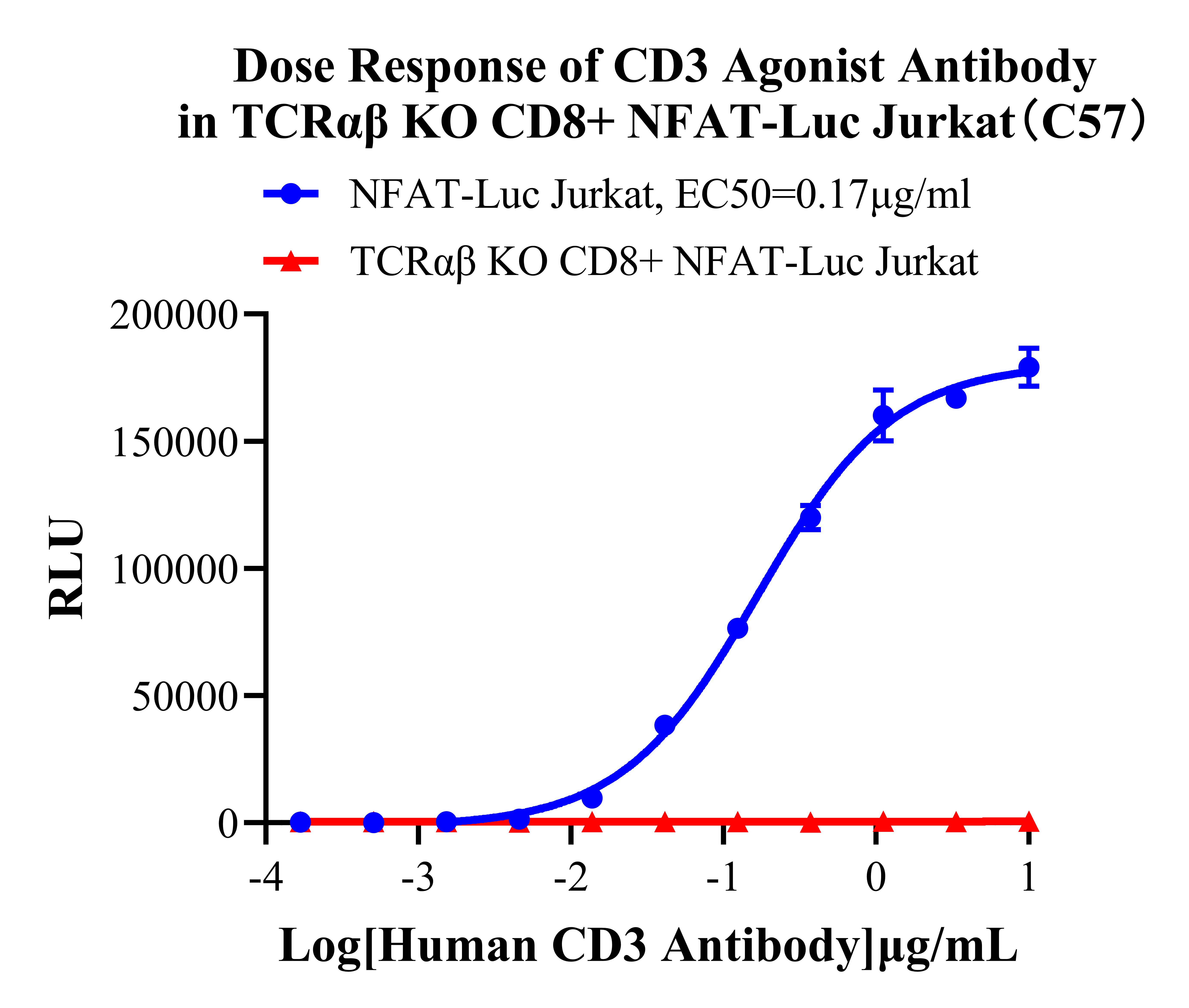 ![]() Figure 2. TCRαβ KO CD8+ NFAT-Luc Jurkat 細胞,在 TCRαβ KO NFAT-Luc Jurkat 細胞上過表達 CD8A 和 CD8B,見上圖流式驗證 CD8A 和 CD8B 的過表達效果和 TCRαβ的 敲除效果。 ![]() Figure 3. Dose Response of CD3 Agonist Antibody in TCRαβ KO CD8+ NFAT-Luc Jurkat(C57). |