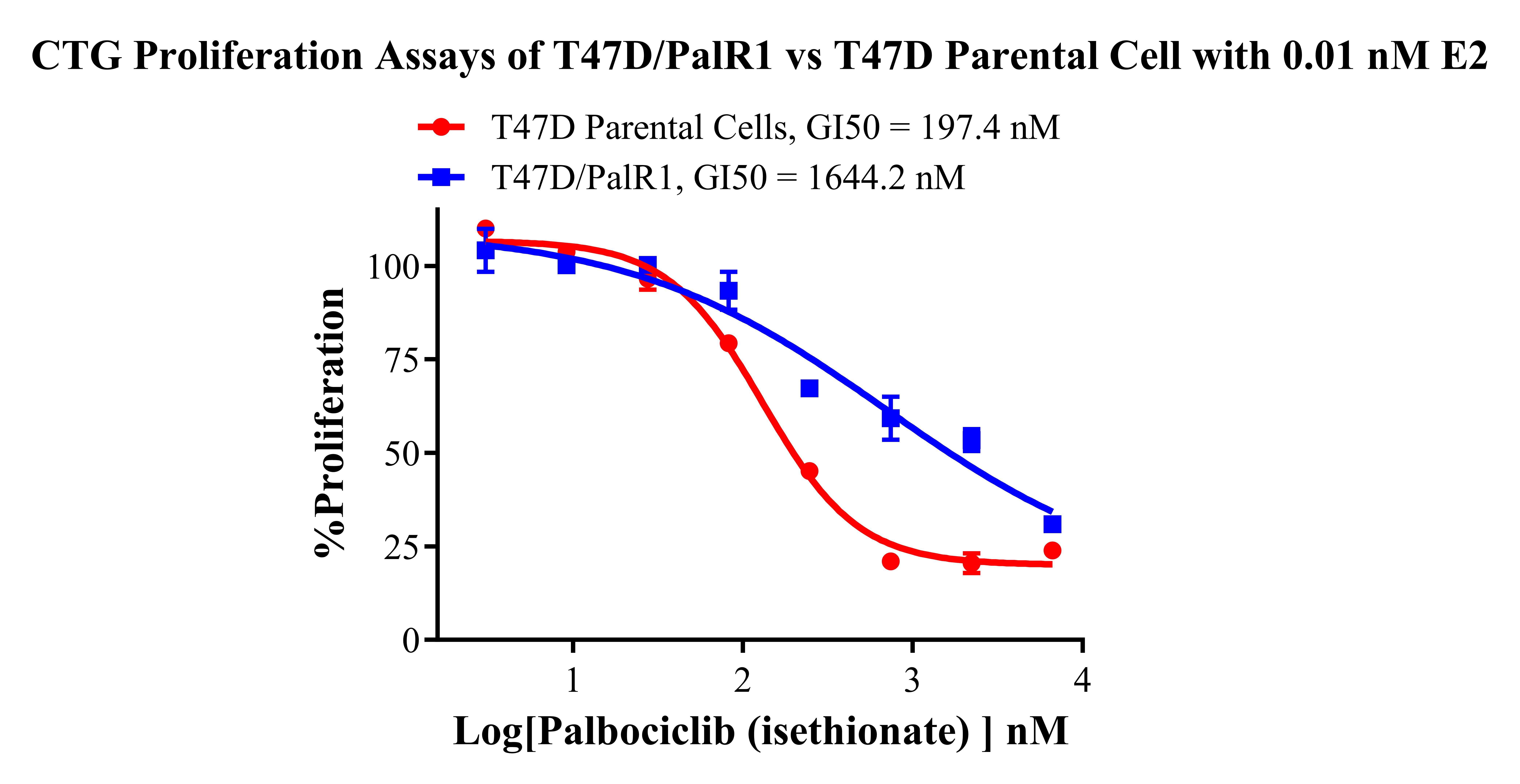 Figure 1. CTG Proliferation Assays of T47D/PalR1 vs T47D Parental Cell with 0.01 nM E2. |