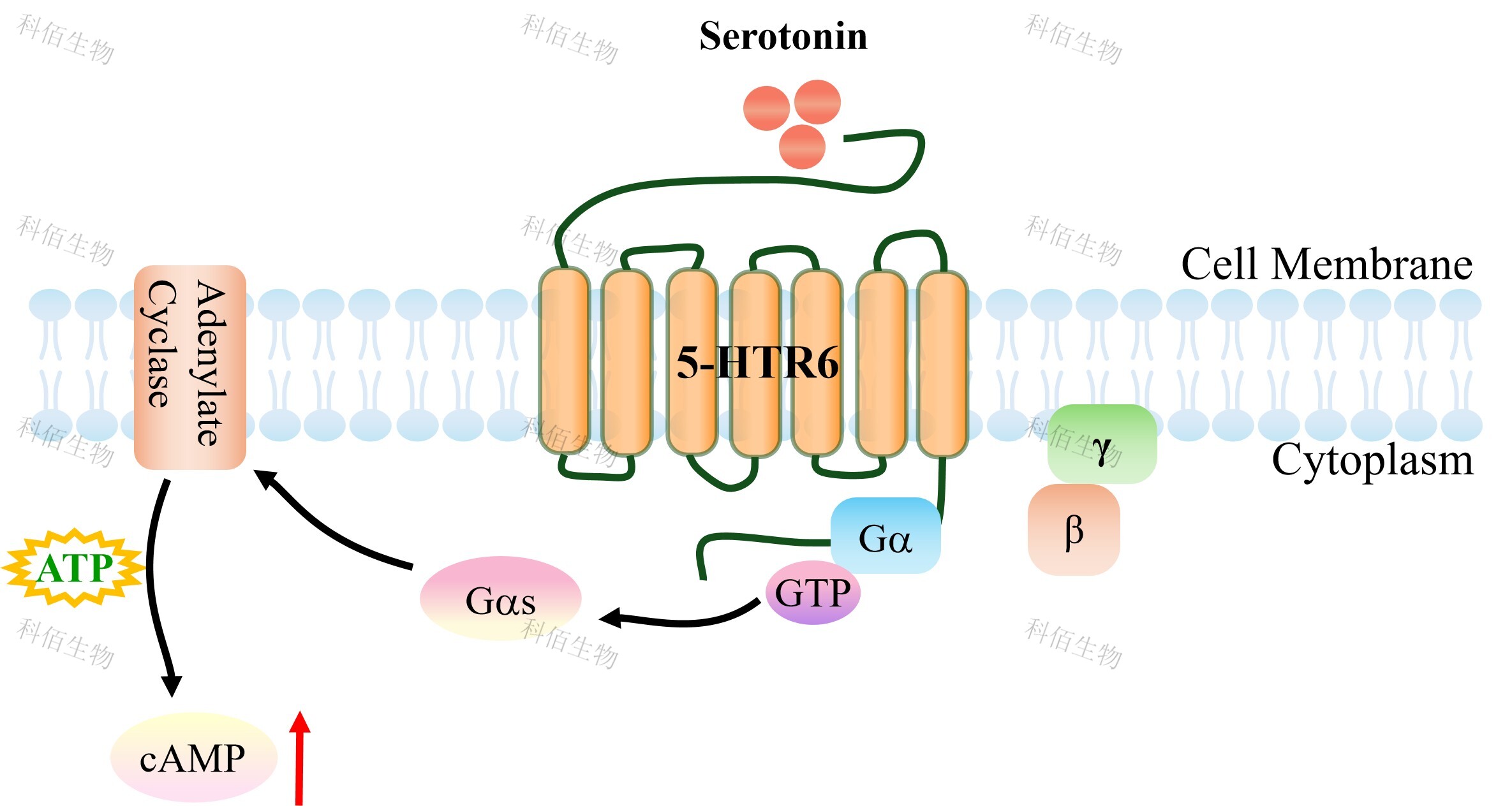| cAMP 在 G 蛋白偶聯(lián)受體(GPCR)信號(hào)轉(zhuǎn)導(dǎo)中是一種關(guān)鍵的第二信使。當(dāng)配體結(jié)合 到 GPCR,構(gòu)象發(fā)生變化,激活受體接著激活 G 蛋白,Gs 的激活導(dǎo)致腺苷酸環(huán)化酶調(diào)控 cAMP 的升高。 5-HTR6 HEK293 細(xì)胞藥靶模型很好的模擬了體內(nèi) 5-HTR6 的信號(hào)轉(zhuǎn)導(dǎo)過程,原理見下圖所示。 ![]() Figure 1. 5-HTR6 HEK293 細(xì)胞模型原理圖 |