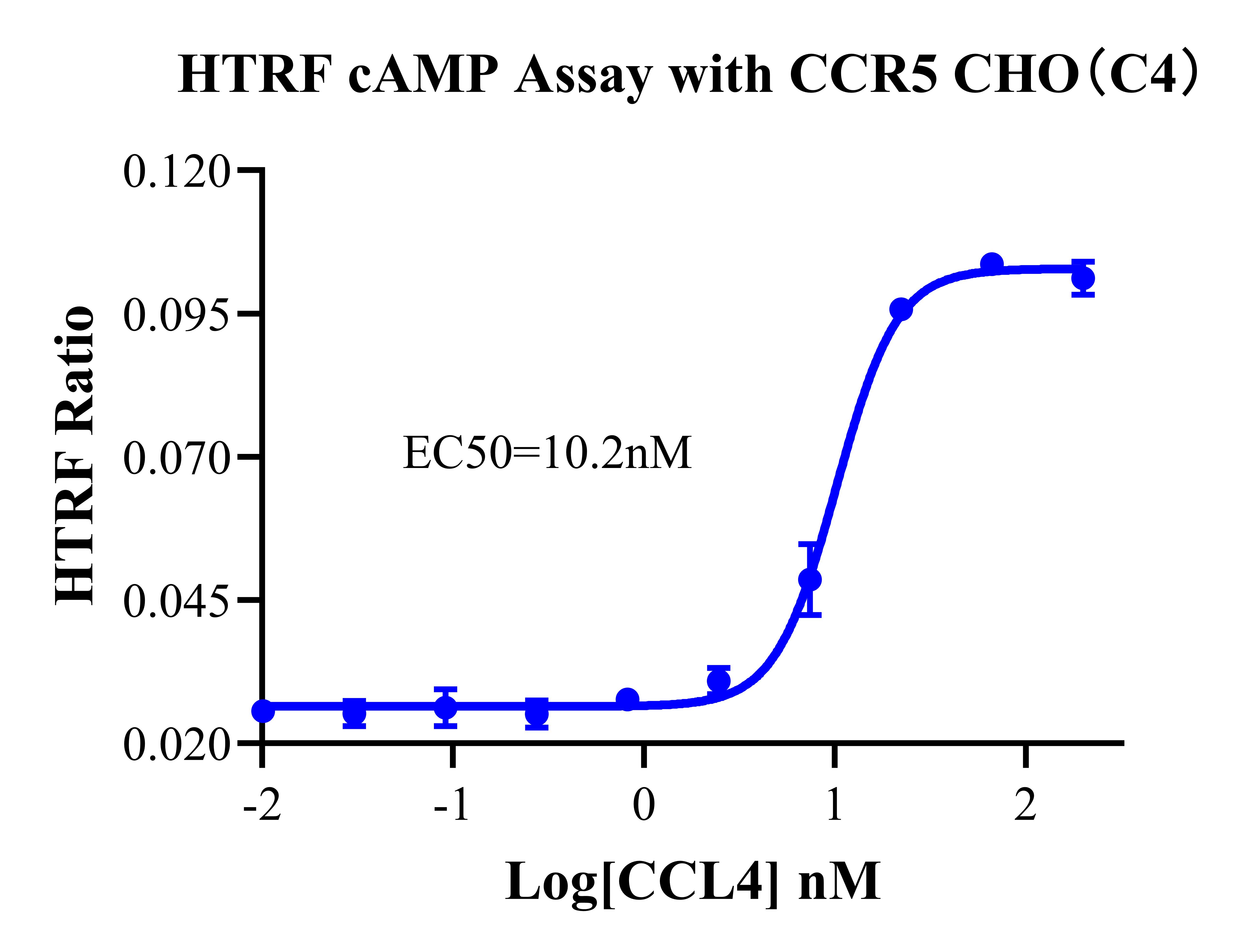 cAMP 在 G 蛋白偶聯(lián)受體(GPCR)信號轉(zhuǎn)導(dǎo)中是一種關(guān)鍵的第二信使。當(dāng)配體結(jié)合到 GPCR,構(gòu)象發(fā)生變化,激活受體接著激活G蛋白,Gi的激活導(dǎo)致腺苷酸環(huán)化酶調(diào)控 cAMP 的下調(diào)。CCR5 藥靶模型很好的模擬了體內(nèi) CCR5 的信號轉(zhuǎn)導(dǎo)過程,原理見下圖所示。![]() Figure 1. CCR5 CHO 細胞模型原理圖