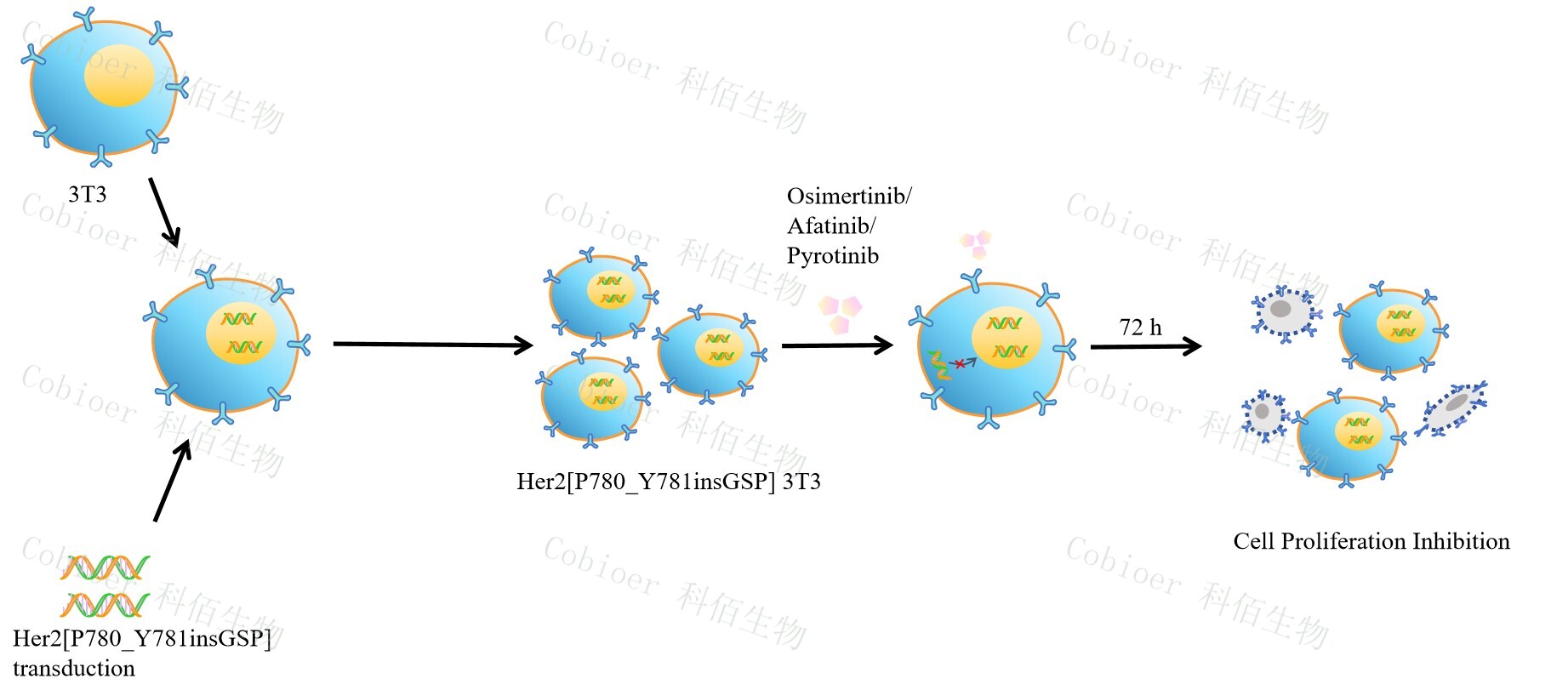 HER2[P780_Y781insGSP] 3T3 藥靶細胞 , 通過轉(zhuǎn)導(dǎo)突變狀態(tài)的 HER2[P780_Y781insGSP] 基因到 3T3 細胞系中 , 穩(wěn)定表達人突變形態(tài)下的 HER2[P780_Y781insGSP]基因,原理及流程見下圖所示。![]() Figure 1. HER2[P780_Y781insGSP] 3T3 細胞的構(gòu)建原理圖 |