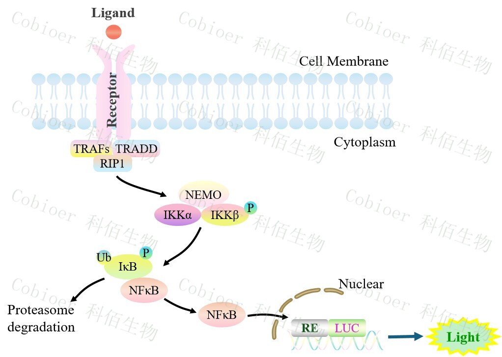 NFκB-Luc HEK293 報告基因細胞,是由 NFκB 調控并表達 Luc 熒光素酶 報告基因的 HEK293 細胞。配體與受體結合后,激活 NF-κB 的原理見下圖所示。![]() Figure 1:NFκB-Luc HEK293 細胞模型原理圖 |