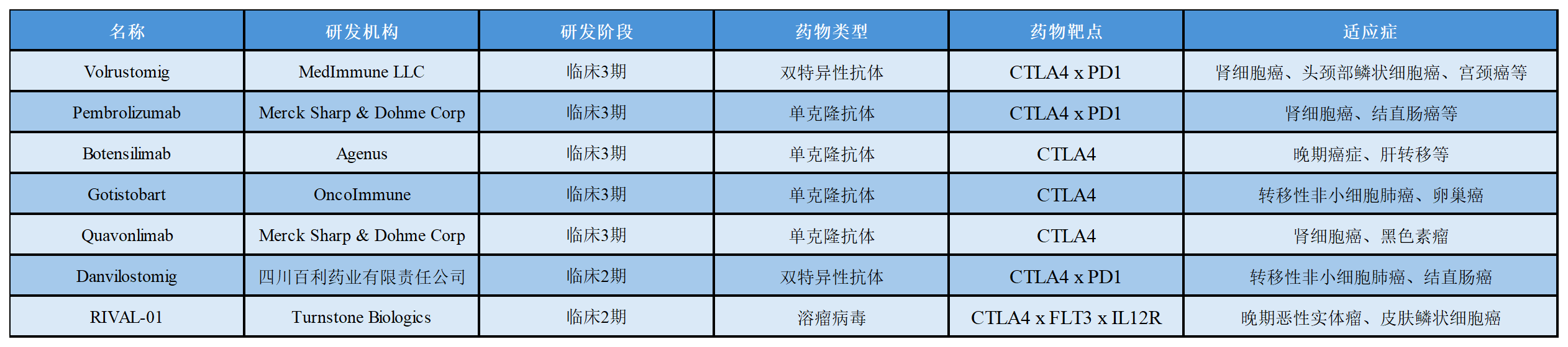 關(guān)于CTLA4在研的部分藥物進(jìn)展如下表所示: