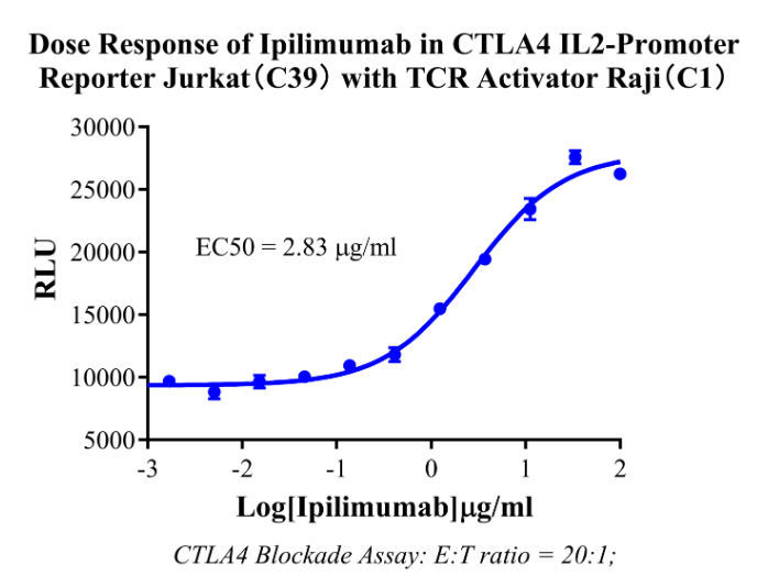 Figure 4. Dose Response of lpilimumab in CTLA4 IL2-Promoter Reporter Jurkat (C39) with TCR Activator Raji (C1).