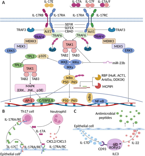 IL-17 細胞因子具有一個半胱氨酸環(huán)結構,它們會與特定的 IL-17R 受體結合,通過 SEFIR、SEFEX 和 CBAD 結構域激活免疫信號傳導。IL-17 信號傳導始于 IL-17A/A、IL-17A/F 或 IL-17F/F 細胞因子與其受體(IL-17RA 和 IL-17RC)的結合,或者 IL-17E/E 細胞因子與其受體(IL-17RA 和 IL-17RB)的結合。當配體結合后,Act1 會激活多種獨立的信號傳導途徑,這些途徑通過不同的 TRAF 蛋白介導。TRAF6 的激活會導致 NF-κB、C/EBPβ、C/EBPδ 和 MAPK 信號通路的觸發(fā)。IL-17R-Act1 復合物還通過 TRAF4 與 MEKK3 和 MEK5 結合,從而激活 ERK5。不同類別的抑制劑,如泛素酶(TRAF3)、去泛素酶(A20)、RBP(HuR、ACT1、Aridα 和 DDX3X)、內(nèi)切核糖核酸酶(MCPIP1/Regnase-1)和微小 RNA(miR-23b),通過各種獨立的機制負向調(diào)節(jié) IL-17 信號傳導。IL-17C 主要由上皮細胞表達。當 IL-17RA/RE 受體復合物表達時,上皮細胞本身和 TH17 細胞都是 IL-17C 的作用靶點。除了增加 Th17 細胞中 IL17A 的表達外,IL-17C 還通過間接方式增強吸引中性粒細胞的趨化因子在上皮細胞中的表達,最終導致強烈的炎癥反應。