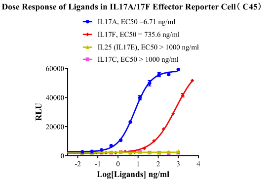 為了助力IL17相關靶點藥物的研發(fā),科佰生物分別開發(fā)了針對IL17A/F和IL25的細胞模型,用于候選藥物早期機理研究。部分結果如下: