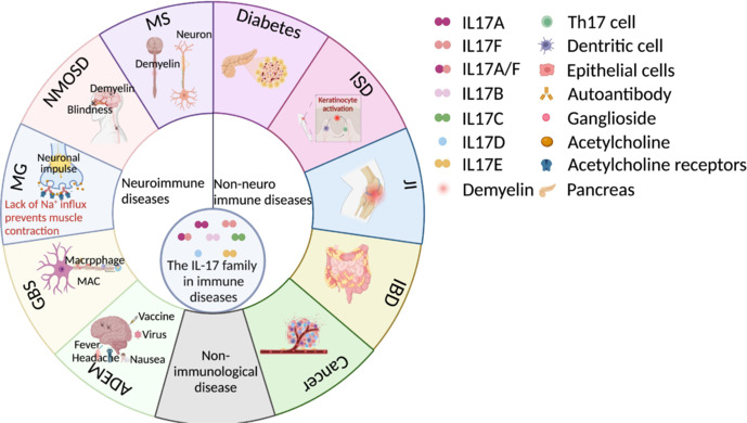 IL-17 細胞因子參與多種免疫調(diào)節(jié),對自身免疫性疾病及免疫相關疾病(如多發(fā)性硬化癥、視神經(jīng)脊髓炎譜系疾病、重癥肌無力、吉蘭-巴雷綜合征和急性播散性腦脊髓炎)以及非神經(jīng)免疫性疾病中的炎癥和病理過程產(chǎn)生影響。
