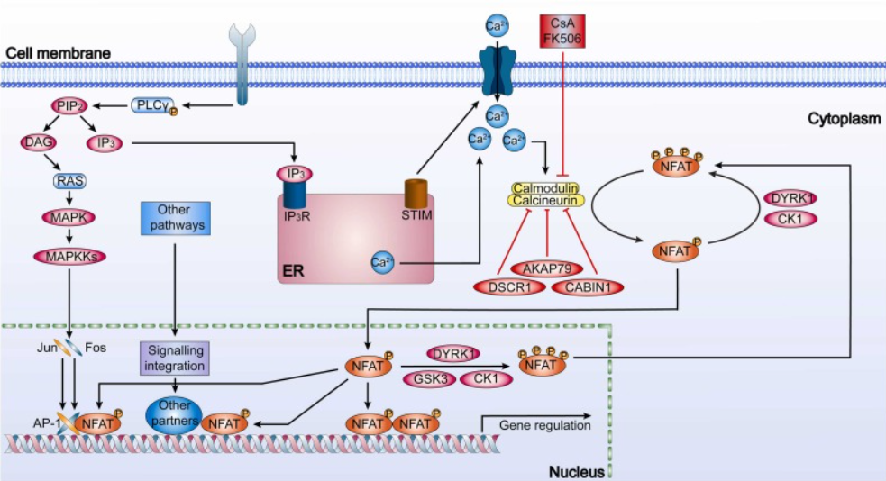 當(dāng)NFAT蛋白在SRR和SP區(qū)域的絲氨酸殘基上被強(qiáng)烈磷酸化時(shí),這些蛋白被限制在細(xì)胞質(zhì)中。細(xì)胞表面受體如T細(xì)胞受體(TCR)、受體酪氨酸激酶(RTKs)和G蛋白偶聯(lián)受體(GPCRs)的激活,引發(fā)信號(hào)級(jí)聯(lián)反應(yīng)。磷脂酶C(PLC)被激活?;罨疨LC催化了磷脂酰肌醇-4,5-雙膦酸鹽(PIP2)的水解,生成哧啶醇-1,4,5-三磷酸(IP3)和二酰甘油(DAG)。IP3與內(nèi)質(zhì)網(wǎng)表面的IP3R結(jié)合,導(dǎo)致內(nèi)質(zhì)網(wǎng)向細(xì)胞質(zhì)短暫的鈣離子流出,短暫地提高細(xì)胞質(zhì)中的鈣水平,但減少內(nèi)質(zhì)網(wǎng)的鈣儲(chǔ)備。儲(chǔ)備鈣的消耗導(dǎo)致內(nèi)質(zhì)網(wǎng)上的鈣感應(yīng)器STIM形成寡聚體,并遷移至內(nèi)質(zhì)網(wǎng)-質(zhì)膜連接處,在那里它們結(jié)合并激活質(zhì)膜上的Orai(CRAC通道)。Orai形成四聚體通道,開啟持續(xù)的低振蕩性鈣流入,與細(xì)胞質(zhì)中的鈣傳感器鈣調(diào)素(CAM)結(jié)合,形成鈣/鈣調(diào)蛋白/鈣神經(jīng)素復(fù)合物,激活鈣神經(jīng)素。鈣化神經(jīng)素具有催化基(CnA)和調(diào)控亞基(CnB)?;罨腃nA脫磷酸化NFAT蛋白并揭露其NLSs,從而實(shí)現(xiàn)核易位。